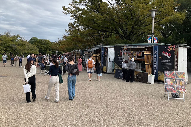 今年の秋も、「大阪城秋まつり2025」の一環として、本丸の南、二の丸・東大番衆小屋跡エリアにて、来園されたお客様に「食」のおもてなしイベントを開催しています。 エリアには、毎日キッチンカー5台がスタンバイし、選りすぐりのフード・ドリンクのサービスを行います。本丸エリア・天守閣を訪れる来園者をはじめ、誰でも使用できるテーブル・椅子やテントをご用意。くつろぎながらサクラモミジ越しに内濠の石垣や、桜門からの城郭らしい美しい景観をお楽しみください。