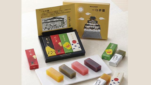 These bite-sized yokan (sweet jellied bean paste desserts) featuring designs of artifacts related to Toyotomi Hideyoshi, a collaboration between the Osaka Castle Museum and Tsuruya Hachiman, are available for purchase at the Osaka Castle Museum Shop, as well as the JO-TERRACE OSAKA Official Shop.